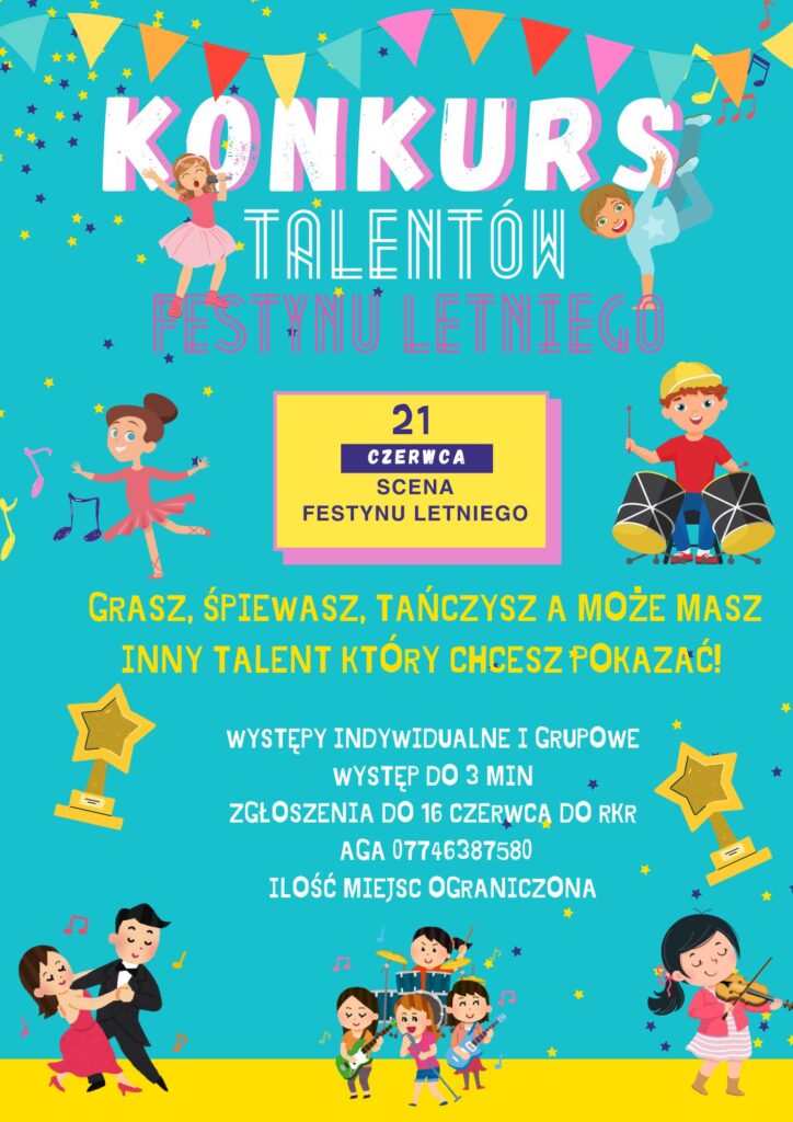 Zapraszamy osoby indywidualne, pary oraz grupy do udziału w Konkursie talentów, który odbędzie się 21 czerwca na scenie Festynu Letniego! Przygotuj krótki występ trwający maksymalnie 3 minuty i pokaż, na co Cię stać.